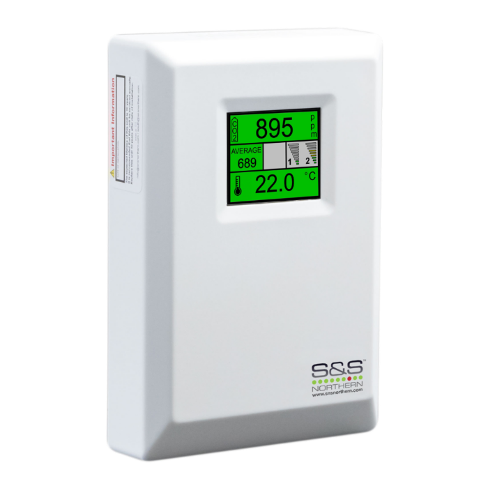 The monitor has a digital traffic light style display indicating the carbon dioxide levels and temperature in the area.